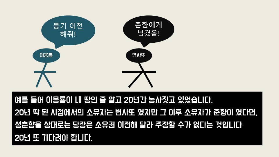 예를 들어 이몽룡이 내 땅인 줄 알고 20년간 농사짓고 있었습니다.