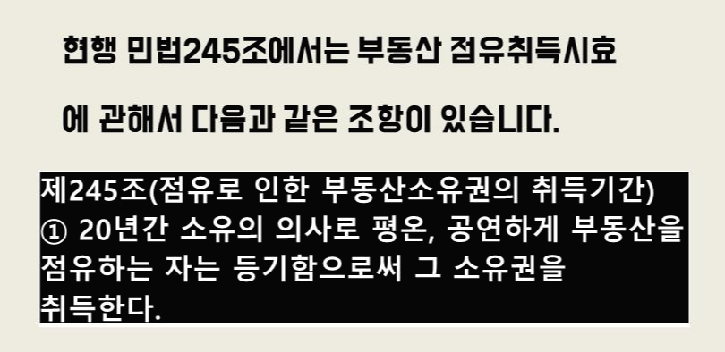 현행 민법245조에서는 부동산 점유취득시효에 관해서 아래와 같은 조항이 있습니다.