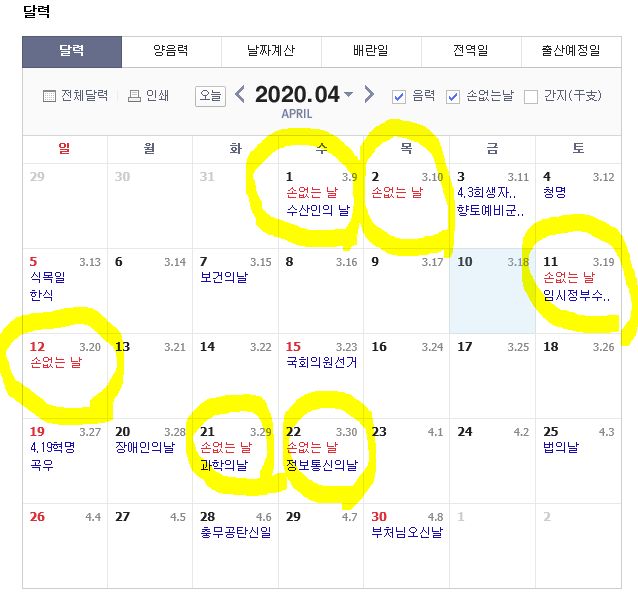 동서남북에서 ‘손(귀신)’이 돌아다니는 날짜를 빼면 9일, 10일, 19일, 20일, 29일, 30일이 바로 손 없는 날이 되는 것입니다.