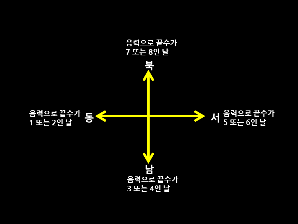 남쪽 - 음력으로 끝수가 3 또는 4인 날