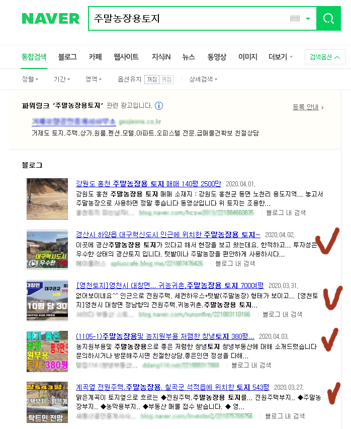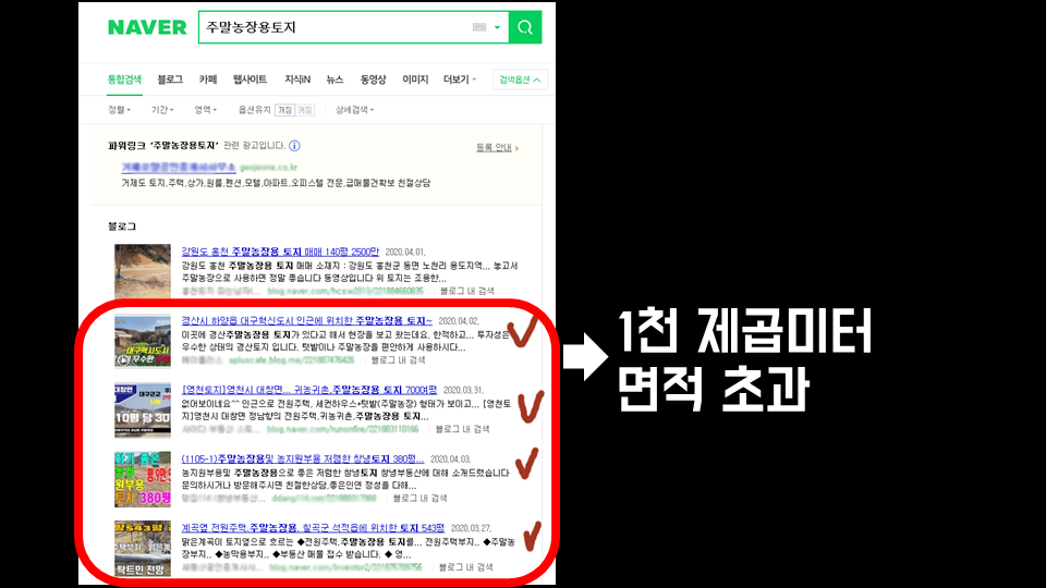 실제로 네이버를 통해서 ‘주말농장용 토지’를 검색해 본 결과 사람들에게 혼동을 줄만한 부동산 블로그 광고글이 상위 5개중 무려 4개나 되는 것을 확인해 볼 수가 있었습니다.