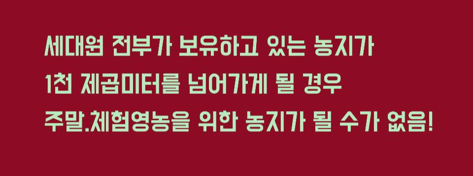 즉 세대원 전부가 보유하고 있는 농지가 1천 제곱미터를 넘어가게 될 경우 주말.체험영농을 위한 농지가 될 수가 없다는 것이죠.
