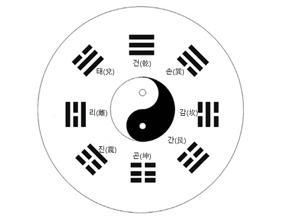 태극문양에서 양의 기운이 가장 강한 곳에는 건괘가 음의 기운이 가장 가득한 곳에는 곤괘가 있는 것을 볼 수가 있습니다.