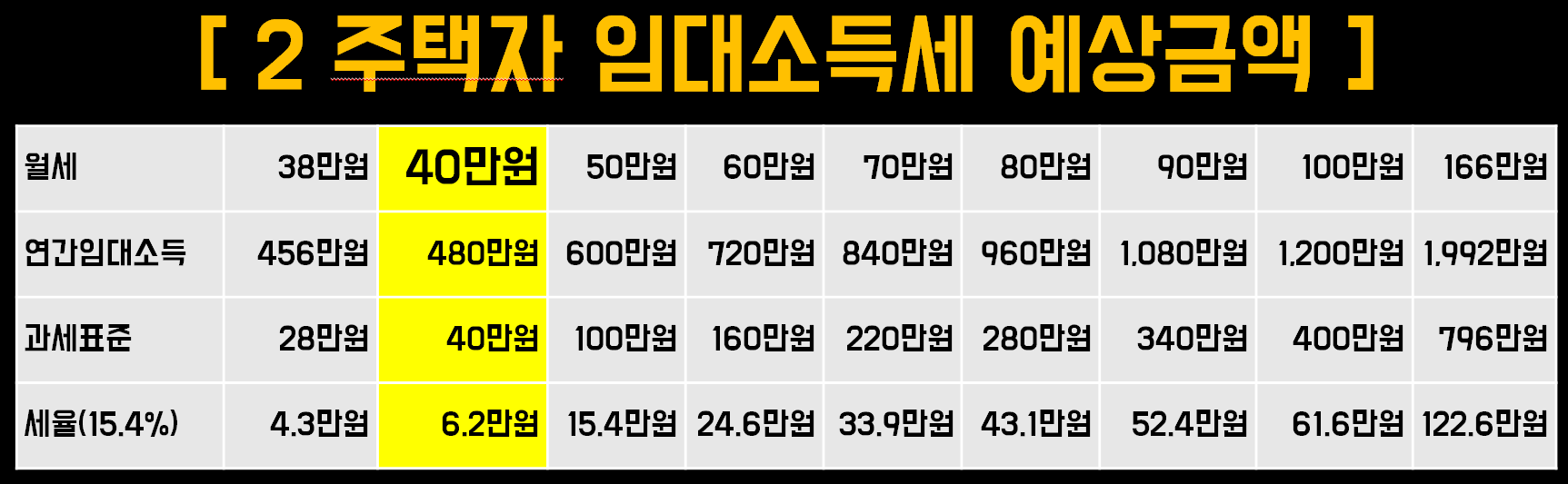 그래서 40만원에 대한 15.4%(지방세 1.4%포함)인 6만 2천원 정도가 임대소득에 대한 세금이 되겠네요.
