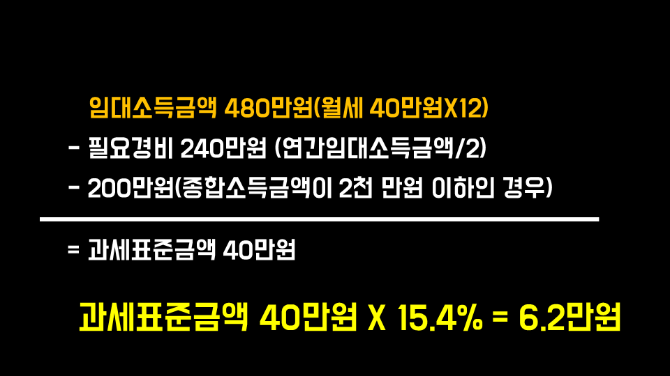 임대소득인 월세 40만원을 받아 연간 480만원의 임대료를 받았다고 한다면 그 중 절반인 240만원을 필요경비로 공제를 하게 됩니다.