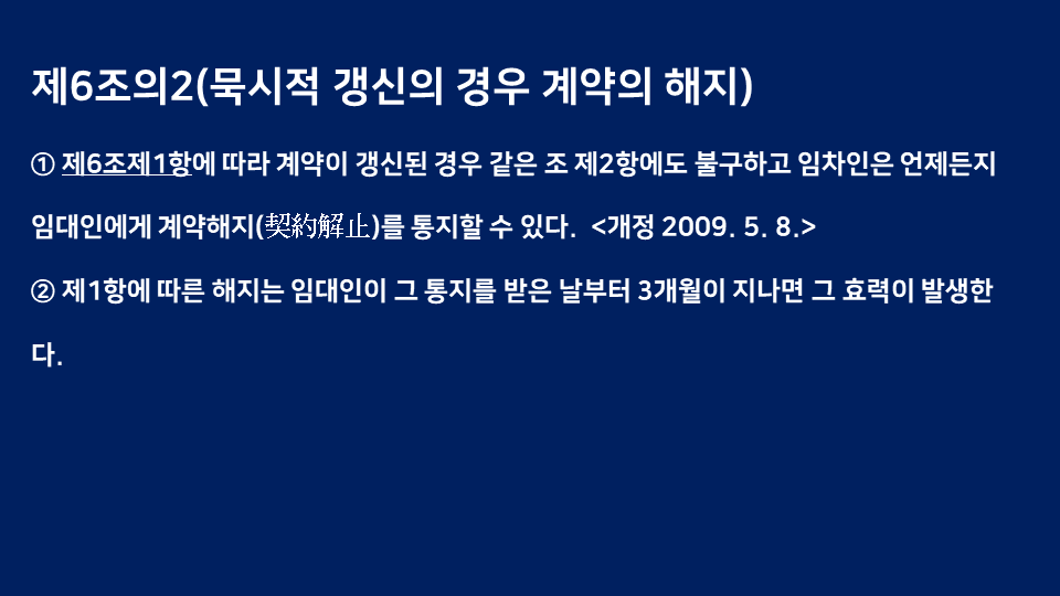 즉 임차인은 계약갱신이 자동으로 이루어 졌다고 하더라도 임대인에게 통지하고 3개월 뒤에는 나갈 수가 있다는 것입니다.