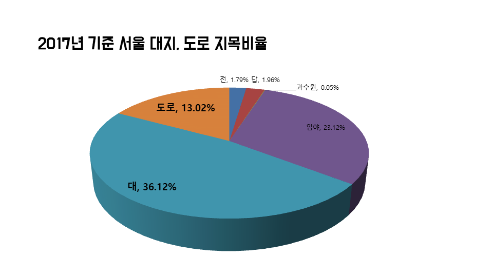 서울지역의 대지 비율은 36.12%, 도로비율은 13.02%