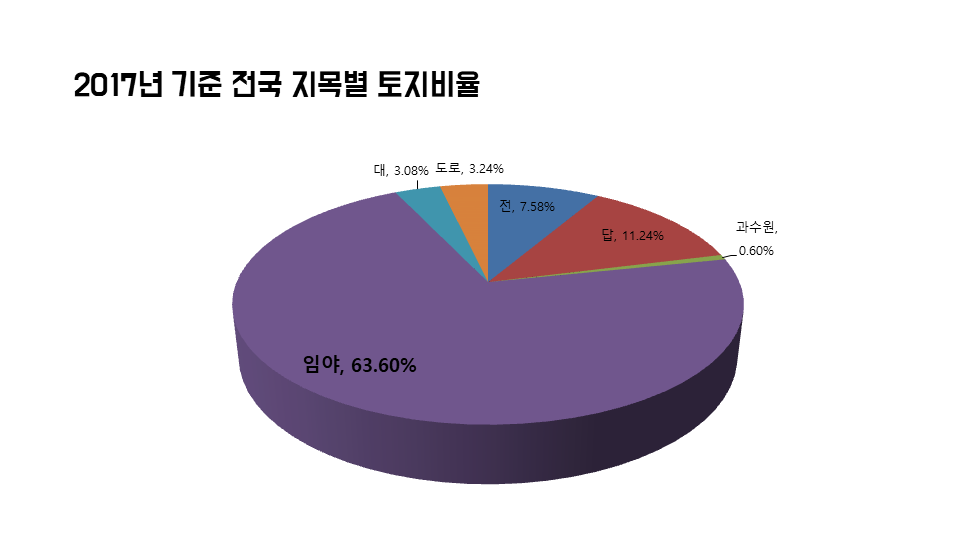 2017년 통계청 자료에 따르자면 전 국토의 지목별 비율은 다음과 같습니다.