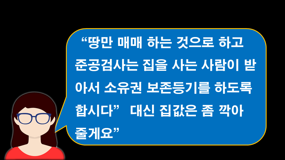아마도 매도자는 “신축전원주택에 대해서 땅만 파는 것으로 하고 준공검사는 새로 집을 사는 사람이 받아서 소유권 보존등기를 하도록 하자” 대신 집값은 좀 깍아 주겠다” 라는 제안을 할 가능성이 큽니다.