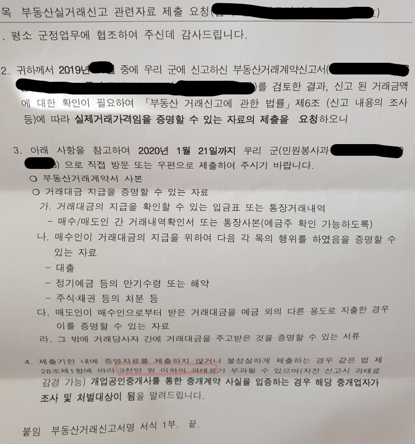 자료제출을 안 하거나 불성실하게 제출하면 '부동산거래신고에관한 법률'에 의거하여 3천만원 이하의 과태료가 부과 될 수도 있다고 하니 우편을 받으면 보통은 크게 놀라시곤 합니다.