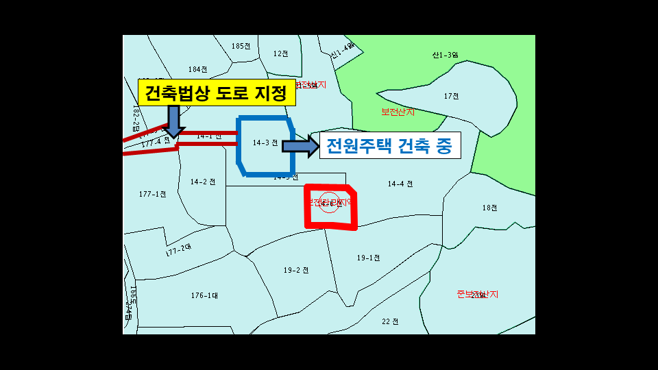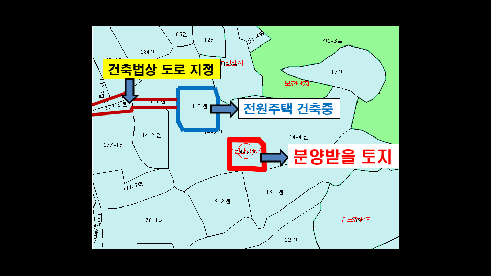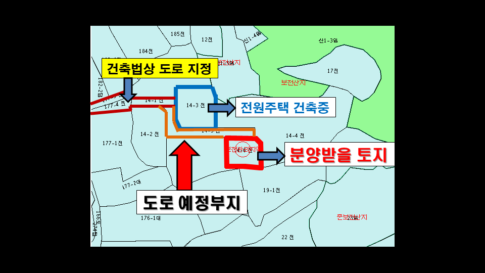 이번 포스팅의 내용은 그 내용이 다소 어려울 수도 있으나 이번 영상에서는 분양중인 전원주택지중에서 도로부지의 지분과 상관없이 건축법에 따른 도로와 접한 경우와 분양중인 전원주택지라도 자칫 맹지를 구입하게 될 수도 있는 경우를 살펴 보도록 하겠습니다.