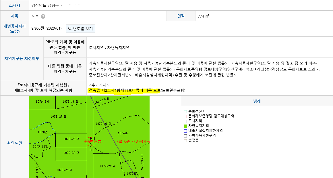 토지 이용계획을 확인해 보니 해당 포장로는 건축법 2조 11항 나목에 따른 도로라고 나오고 있습니다.