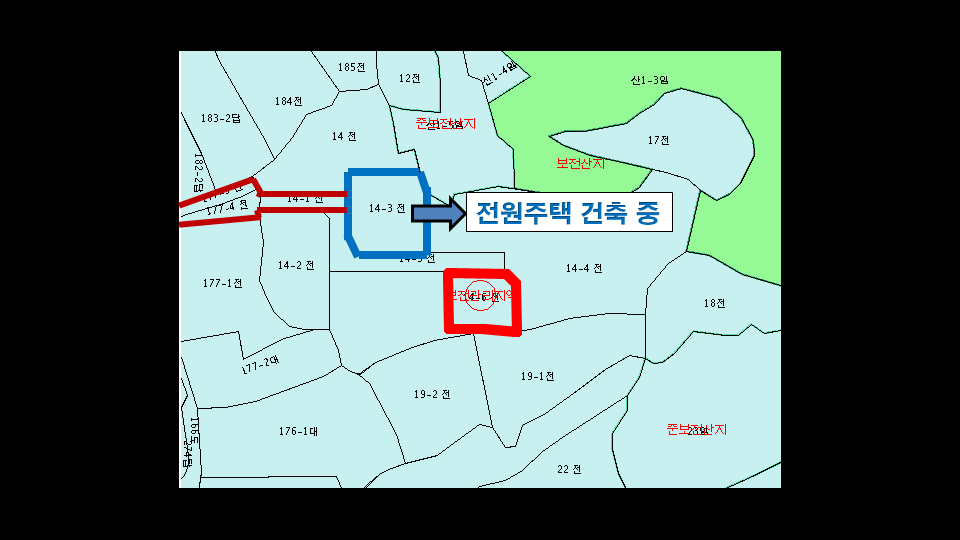 다음과 같이 분양중인 토지의 입구쪽에 전원주택이 한채가 지어지고 있다고 가정을 해 보겠습니다.