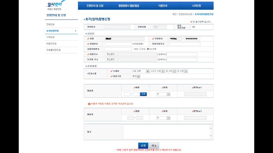 첫 번째로 일사편리에 접속하여 토지이동민원을 선택을 합니다.