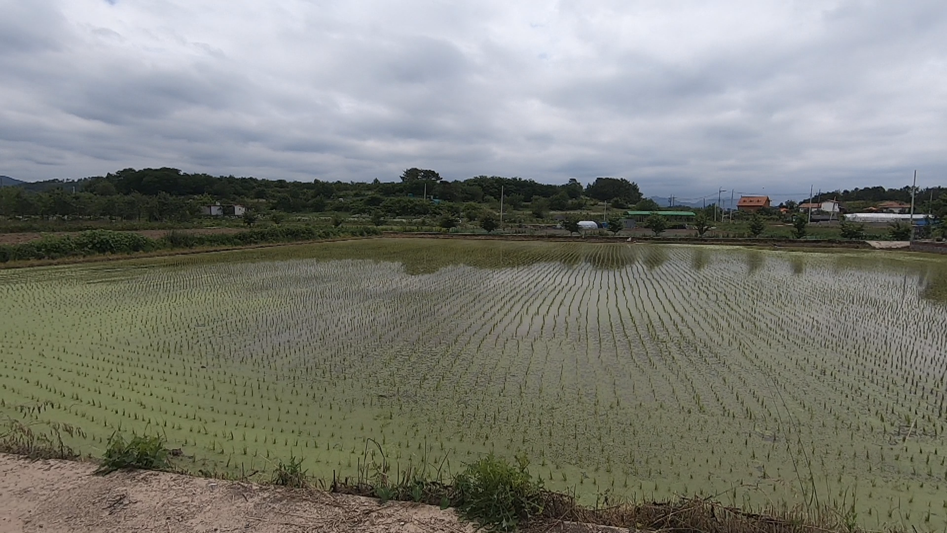 매물로 나온 농지의 현 상태는 벼농사를 경작 중인 상태로 보입니다.