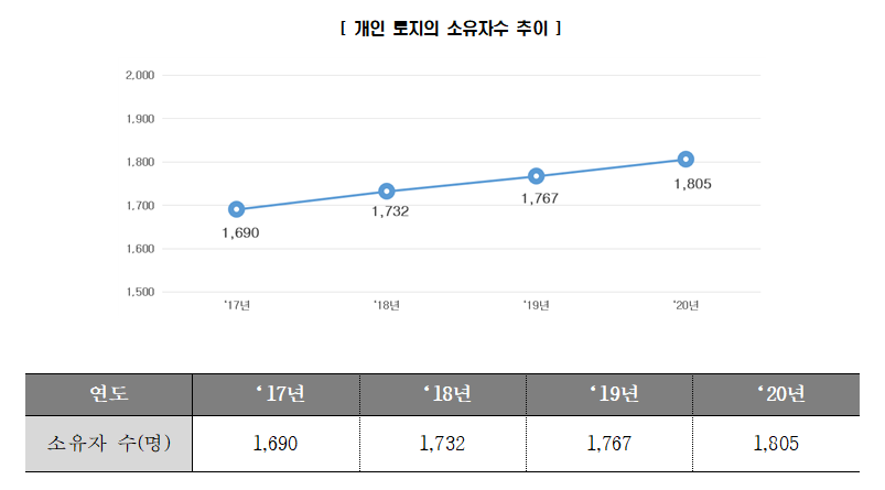 아래는 2017년 이후 부터 조사된 '개인 토지의 소유세대수 추이' 입니다.