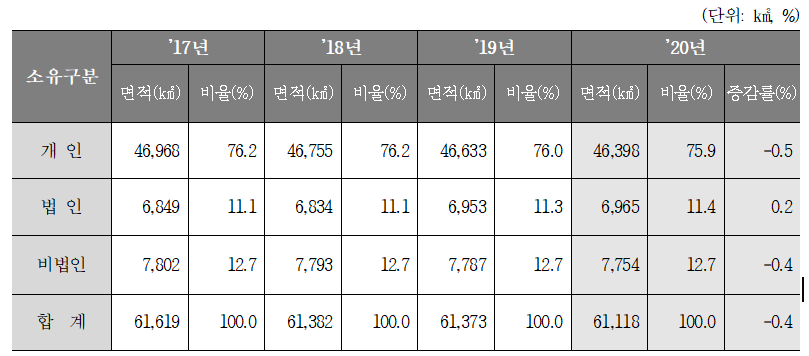 지목별 소유현황은 임야 26,831㎢(57.8%), 전, 답, 과수원, 목장용지 등 농경지가 16,032㎢(34.6%), 대지가 2,551㎢(5.5%) 순으로 나타났습니다.