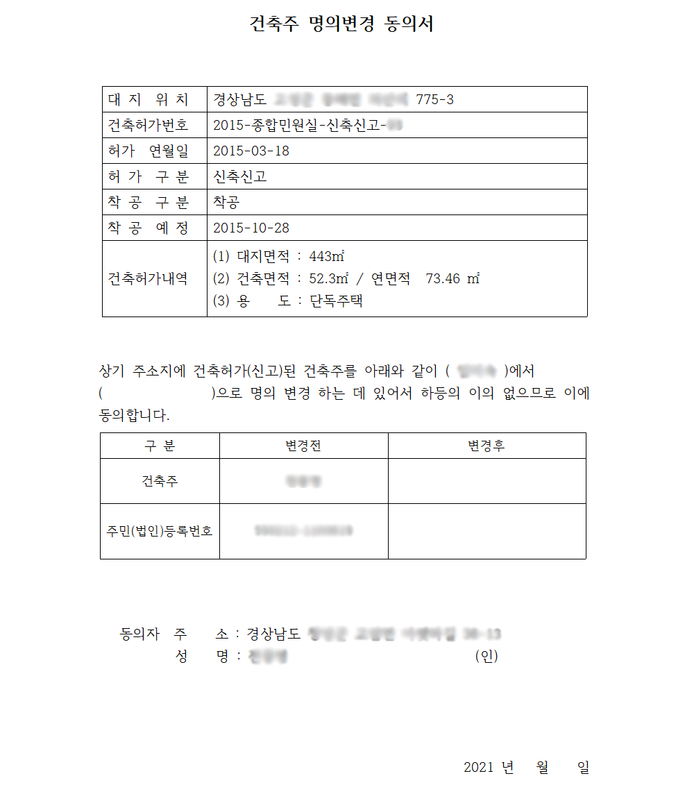 즉 매도자 역시 매수자 명의로 건축주명의변경이 완료된 것을 가정하여 건축주명의변경동의서와 인감증명서를 받아 두는 것입니다.