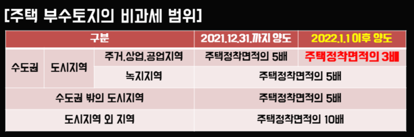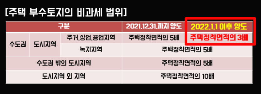 아울러 2022년 1월 1일 이후 부터는 수도권에 소재한 도시지역의 주거.상업.공업지역의 경우에는 주택정착면적의 3배까지만 인정을 해 주게 됩니다.