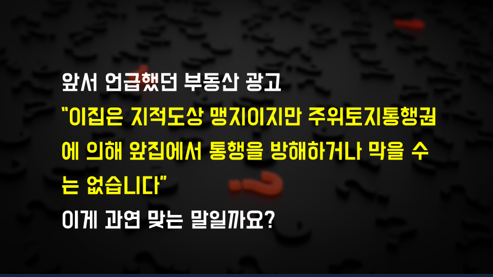 어떤 부동산 광고를 보니 “이집은 지적도상 맹지이지만 주위토지통행권에 의해 앞집에서 통행을 방해하거나 막을 수는 없습니다” 이런 문구를 사용하며 광고를 하고 있더군요.