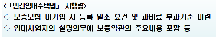 임대보증금 보증 미가입에 대한 처벌이 형벌(2년 이하의 징역이나 2천만원 이하 벌금)에서 과태료 부과(보증금의 10% 이하, 3천만원 상한)로 개정됨에 따라 적어도 형사처벌은 받지 않아도 되는데 상대적으로 과태료는 더 올라갈 수 있을 듯 합니다.