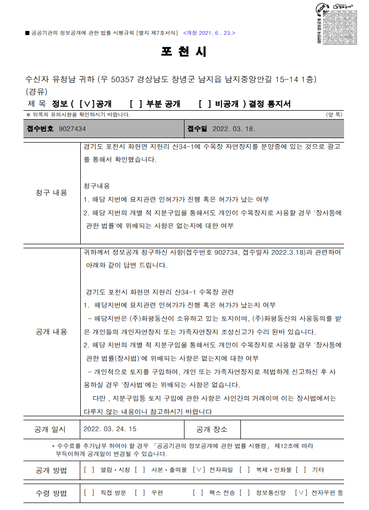 화평랜드 수목장 자연장지는 화평랜드와 제휴전에 제가 직접 포천시청에 정보공개청구를 하여 법적인 문제가 없는지를 확인해 보았습니다.