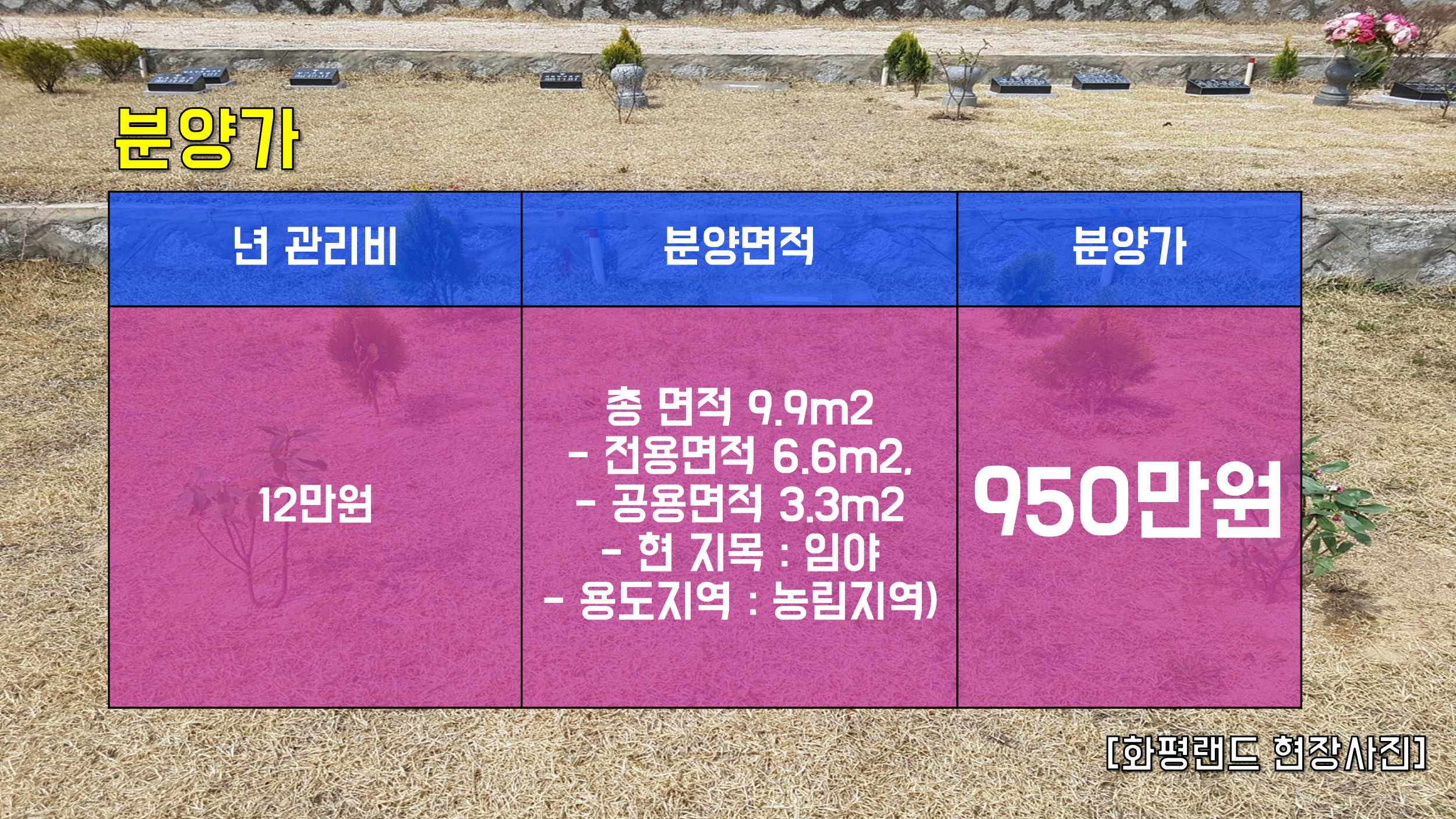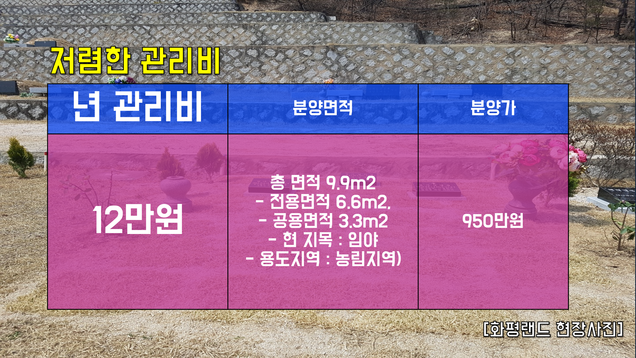 화평랜드에서는 년 12만원의 벌초 대행비 수준도 안되는 저렴한 관리비로 고인을 안심하고 모실 수가 있습니다.