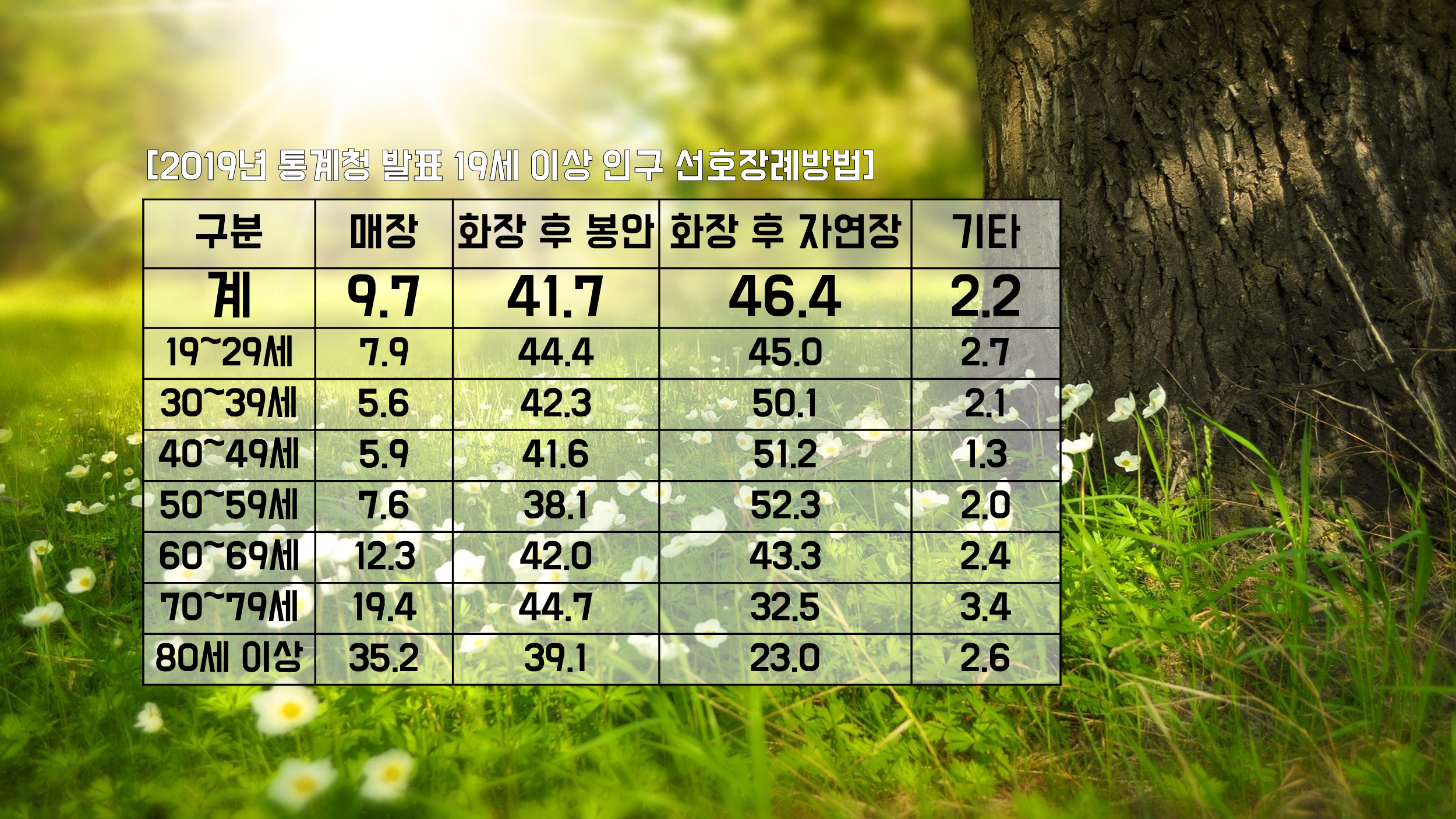 2019년도 통계청 자료를 살펴보자면 60세 이하에서는 90% 이상이 자연장 또는 화장 후 봉안을 하는 것을 선호하는 것으로 조사가 되었습니다.