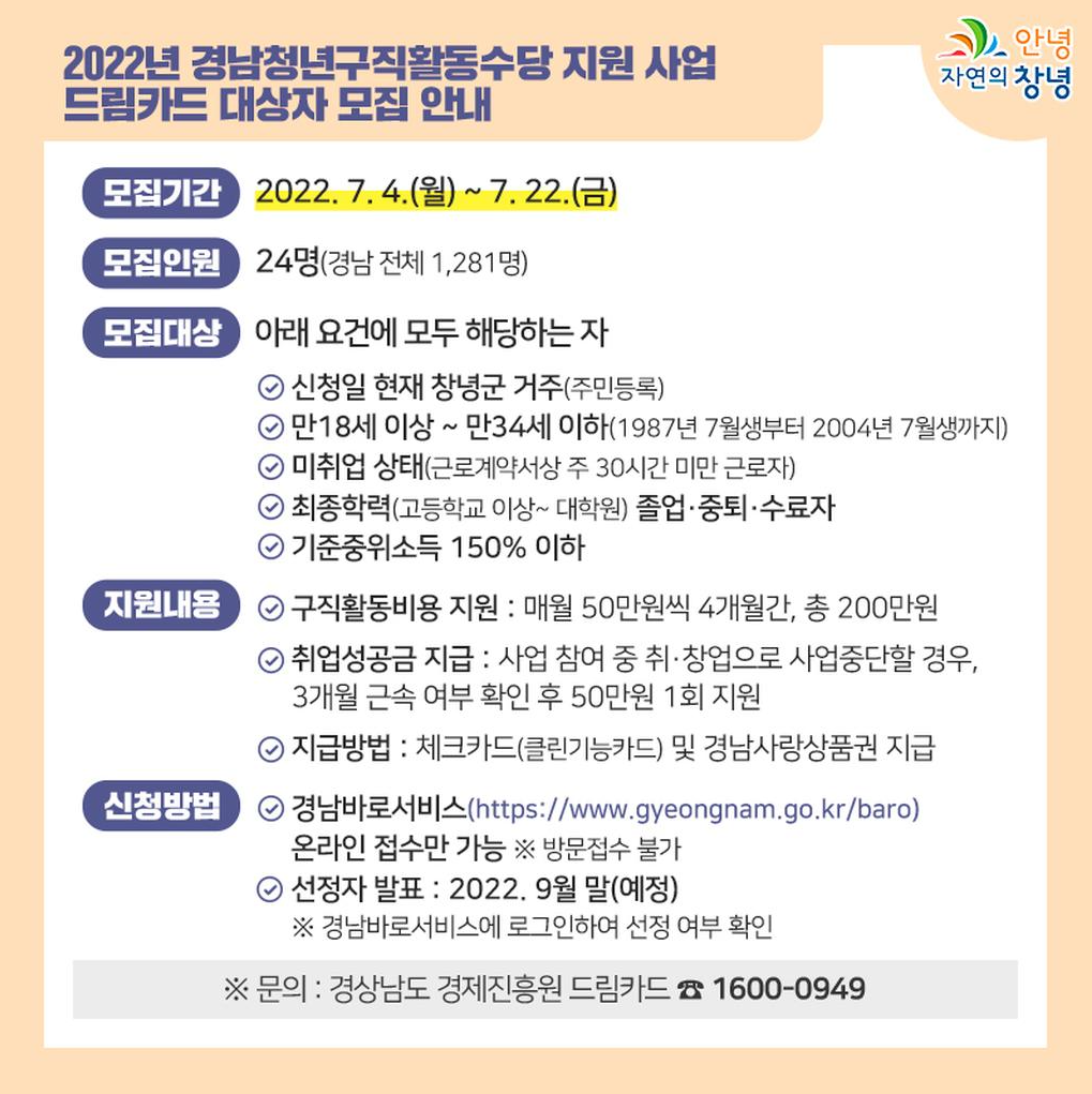 창녕군에서는 오는 2022년 7월 22일까지 2022년 청년구직활동수당 지원사업 드림카드 대상자를 모집한다고 합니다.
