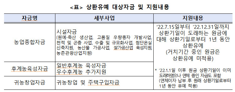 이번 조치는 올해 1월 1일 이후 원금 상환기일이 도래하여 현재 연체 중이거나, 올해 7월 15일부터 12월 31일 사이에 상환기일이 도래할 예정인 농업종합자금(시설자금)*, 후계농육성자금, 귀농 창업 및 주택구입 지원자금을 대상으로 총 2,076억 원으로 추정된다고 합니다.