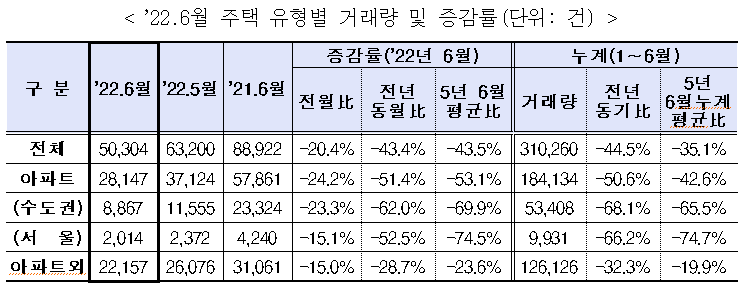 2022.6월까지 누계 기준으로 아파트 거래량은 전년 동기 대비 50.6% 감소한 것으로 확인이 되었습니다.