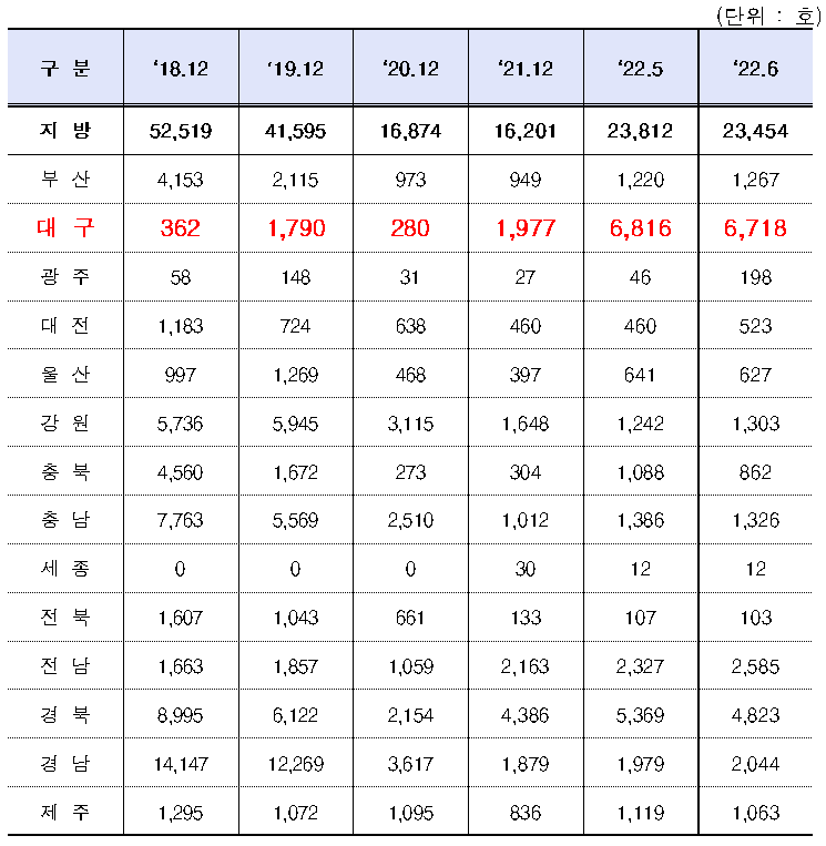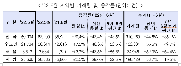 2022.6월까지 누계 기준, 수도권(123,831건)은 전년 동기 대비 55.5% 감소, 지방(186,429건)은 33.7% 감소하였습니다.