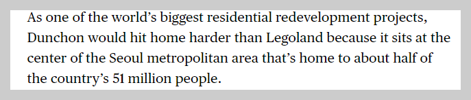 "세계에서 가장 큰 규모의 주거 재개발 프로젝트중 하나인 둔촌주공의 경우 5천 100백만의 인구중 절반이 거주하는 서울의 중심에 위치하고 있기 때문에 레고랜드 보다 훨씬더 큰 충격을 줄 수가 있다"