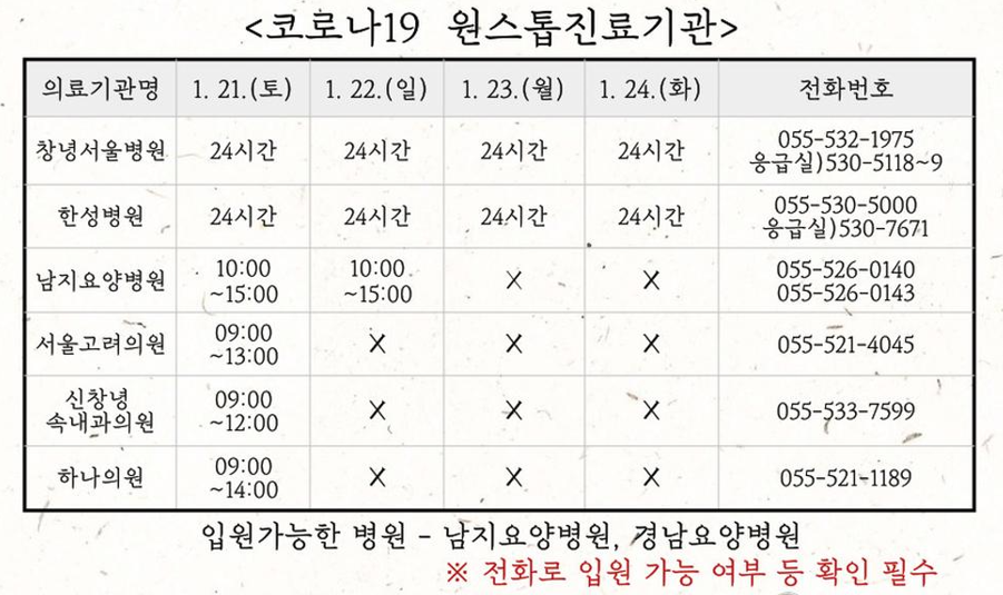 설 연휴기간 동안 창녕군 관내 코로나19 관련 원스톱진료기관 및 먹는약국 판매 하는 곳 안내 입니다.