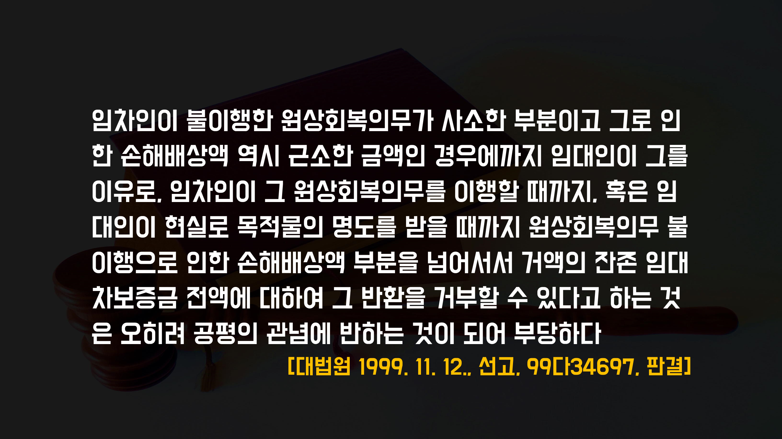 대법원은 임차인이 불이행한 원상회복의무가 사소한 부분이고 그로 인한 손해배상액 역시 근소한 금액인 경우에까지 임대인이 그를 이유로, 임차인이 그 원상회복의무를 이행할 때까지, 혹은 임대인이 현실로 목적물의 명도를 받을 때까지 원상회복의무 불이행으로 인한 손해배상액 부분을 넘어서서 거액의 잔존 임대차보증금 전액에 대하여 그 반환을 거부할 수 있다고 하는 것은 오히려 공평의 관념에 반하는 것이 되어 부당하다고 판결을 내린 사례가 있었습니다.