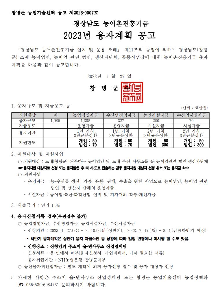 창녕군 2023년 농어촌진흥기금 융자계획이 아래와 같이 공고 되었으니 관내 농업에 종사하시는 개인이나 법인에서는 관심 갖어 보시기 바랍니다.