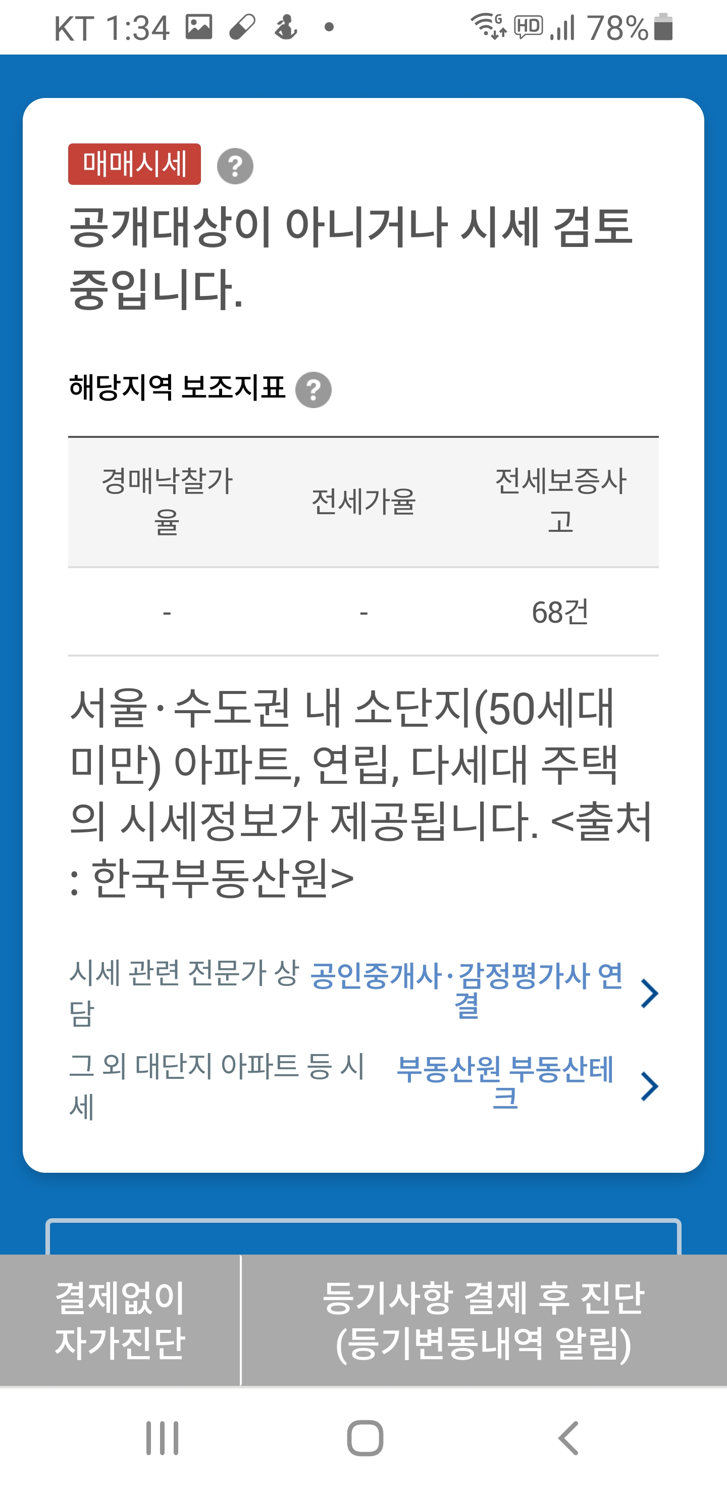 다만 아직 서비스가 되는 대상 주택이 한정되어져 있고 대상주택에 포함되어 있어도 초기단계인지 시세조회와 위험성진단을 해 볼 수 없는 곳이 여전이 많다는 것 입니다.