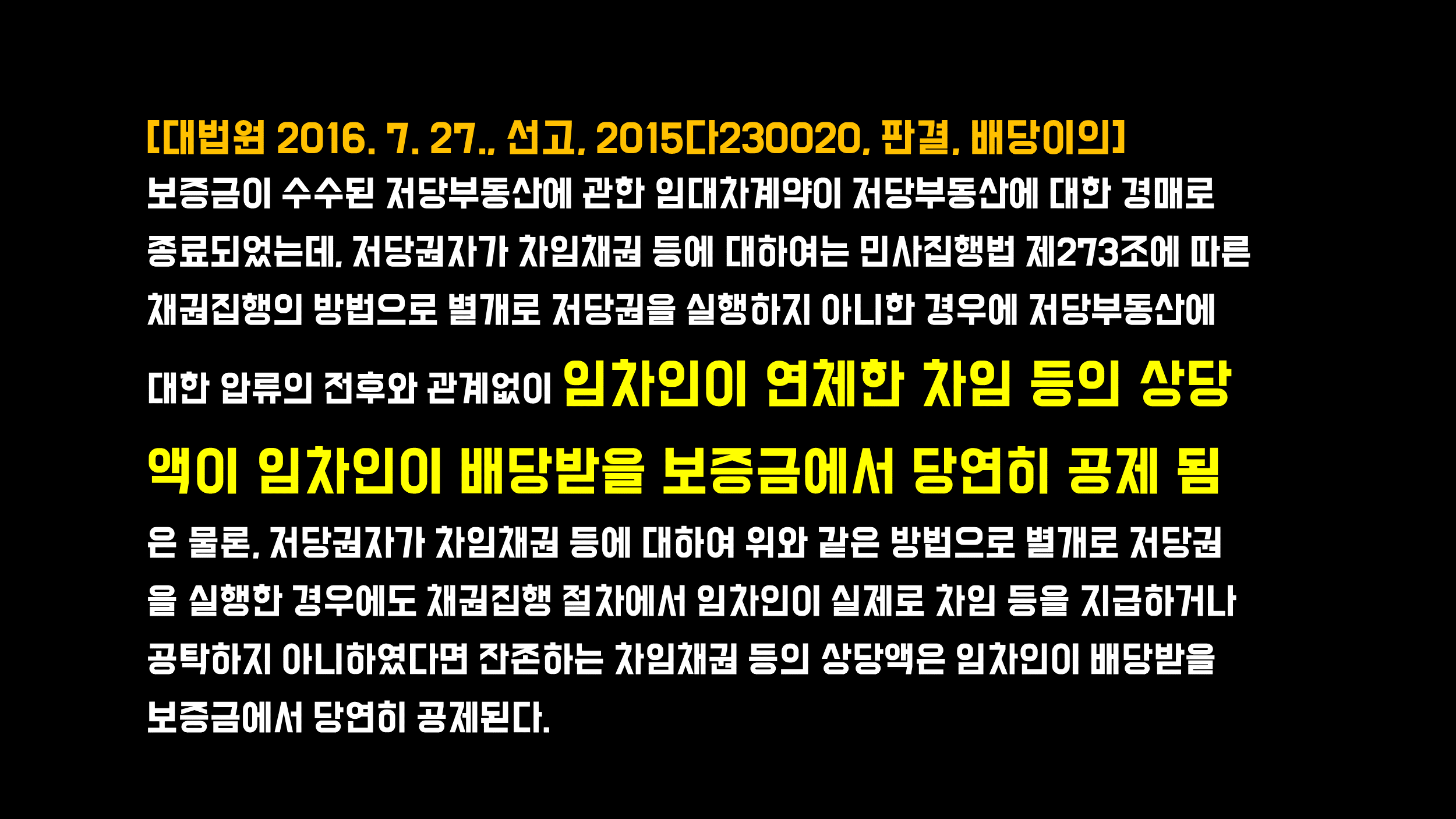 따라서 소액임차인이라 하여 무조건 그 만큼 배당 다 받아갈거라 여기고 월세 안내고 버티면 배당금 한푼도 못 받는 경우가 생길 수도 있다는 것 입니다.