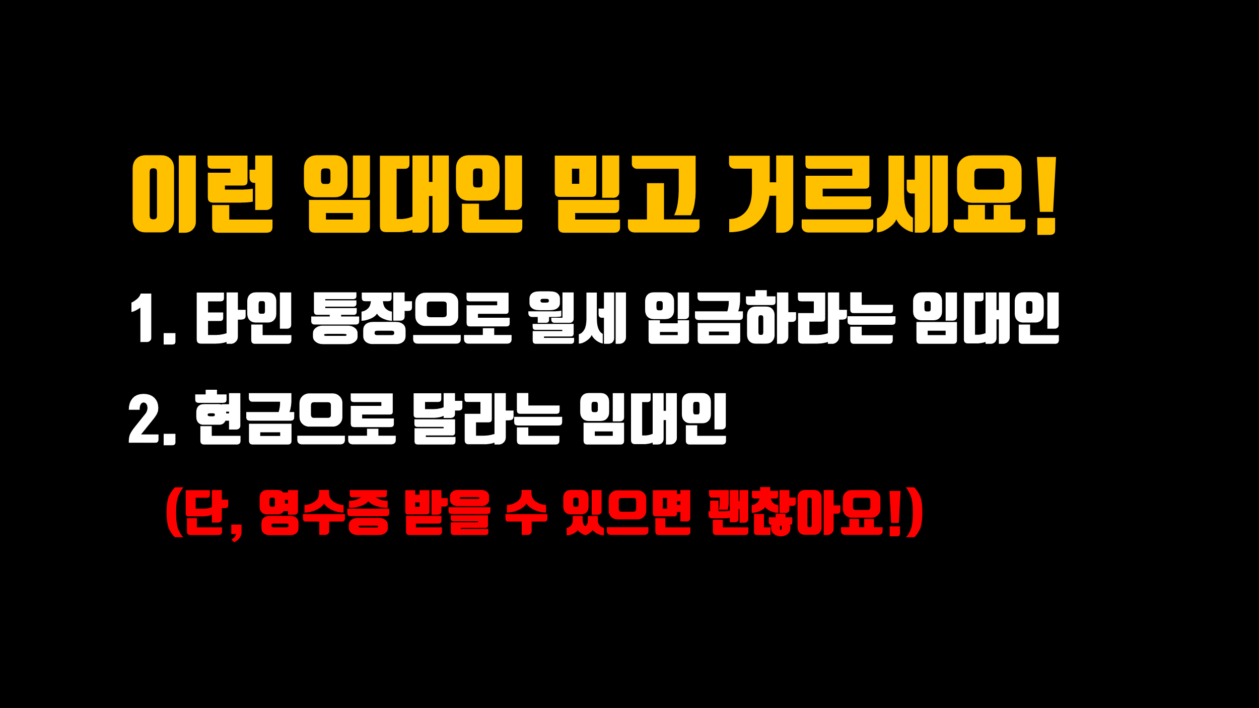 자기 통장으로 돈 받기가 그러니 다른 사람 명의로 월세 입금해 달라 혹은 현금으로 달라고 하는 경우도 있는데 그런 건 그냥 냉정하게 거절을 하시기 바랍니다.