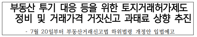 국토교통부 보도자료에 따르자면 토지거래허가제도 개선과 거래가격 거짓신고 과태료 상향 등을 통해 국내 부동산 시장에 변화를 가져올 것으로 보여 집니다.