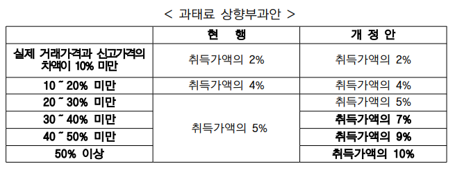 부동산거래신고법의 개정을 통해, 실제 거래가격과 신고가격의 차액이 30%를 초과하는 거래가격 거짓신고에 대한 과태료를 상향 조정하였습니다.