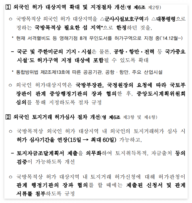 부동산 투기 대응을 위해 국방목적상 외국인 토지거래허가제도를 개선합니다. 이에 관계 기관의 요청과 주요 국가들의 입법 사례를 고려하여 내실 있는 지정 및 협의절차를 정비할 예정입니다.