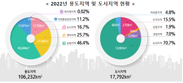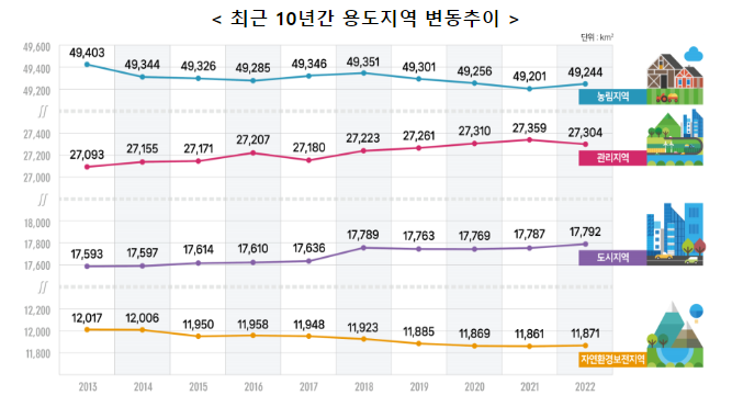 도시지역과 관리지역이 각각 198.4㎢(1.1%↑), 210.3㎢(0.8%↑) 증가 하였고, 농림지역은 158.7㎢(0.3%↓), 자연환경보전지역은 145.6㎢(1.2%↓), 감소한 것으로 확인 되고 있습니다.