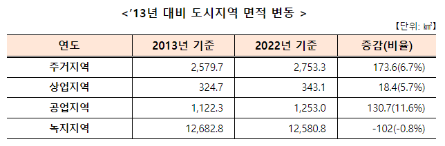 도시지역은 주거지역이 13㎢, 상업지역이 1㎢, 공업지역이 12㎢ 증가하였습니다. 녹지지역과 미세분지역은 각각 12㎢, 9㎢ 감소하였습니다.