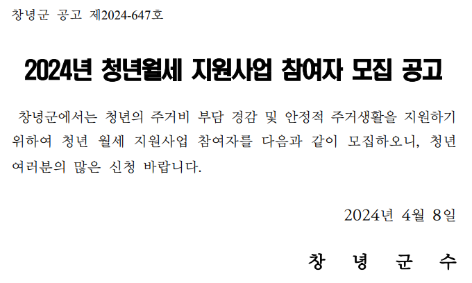 창녕군에서는 청년의 주거비 부담 경감 및 안정적 주거생활을 지원하기 위하여 청년 월세 지원사업 참여자를 다음과 같이 모집하고 있습니다.