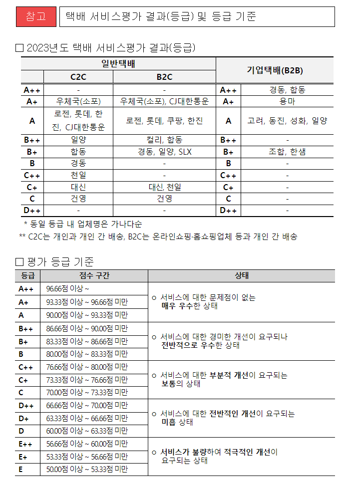 B2C 부문: 우체국(소포)과 CJ대한통운이 A+ 등급을 받으며 공동 1위를 차지했습니다. 쿠팡CLS, 로젠택배, 롯데택배, 한진택배는 A 등급을 받았습니다.