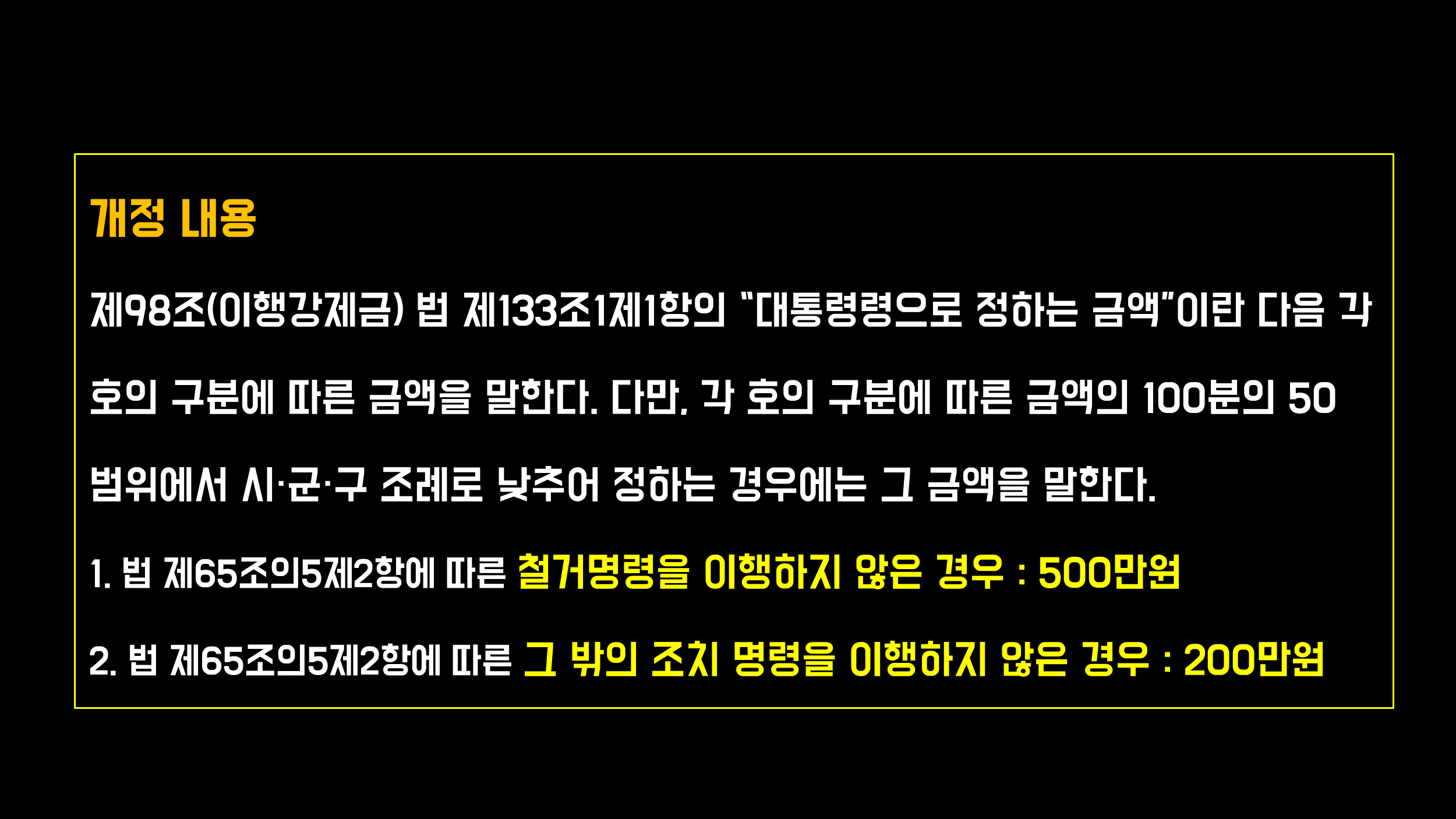 제98조(이행강제금) 법 제133조1제1항의 “대통령령으로 정하는 금액”이란 다음 각 호의 구분에 따른 금액을 말한다. 다만, 각 호의 구분에 따른 금액의 100분의 50 범위에서 시·군·구 조례로 낮추어 정하는 경우에는 그 금액을 말한다.