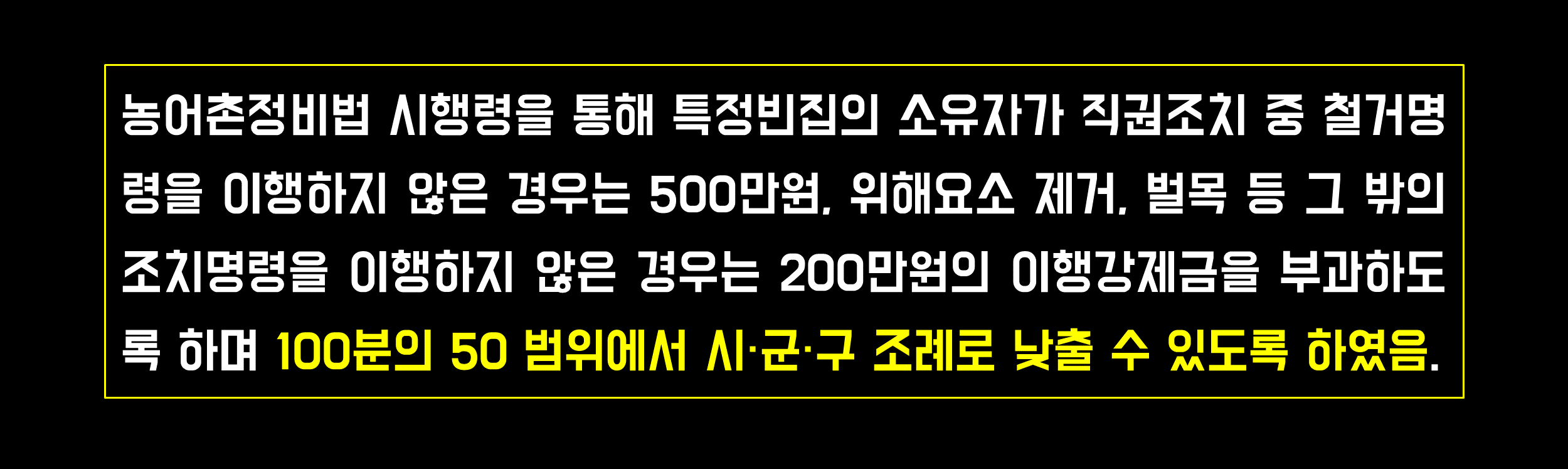즉 농어촌정비법 시행령을 통해 특정빈집의 소유자가 직권조치 중 철거명령을 이행하지 않은 경우는 500만원, 위해요소 제거, 벌목 등 그 밖의 조치명령을 이행하지 않은 경우는 200만원의 이행강제금을 부과하도록 하며 100분의 50 범위에서 시·군·구 조례로 낮출 수 있도록 하였습니다.
