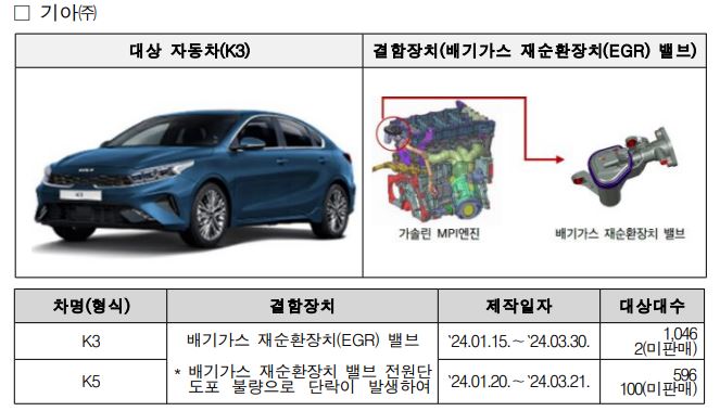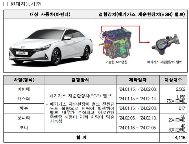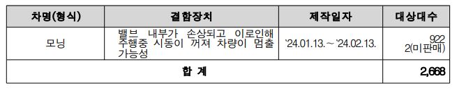 결함: 배기가스 재순환장치(EGR) 밸브 전원단 도포 불량으로 인해 주행 중 시동이 꺼지고 차량이 멈출 가능성이 있음