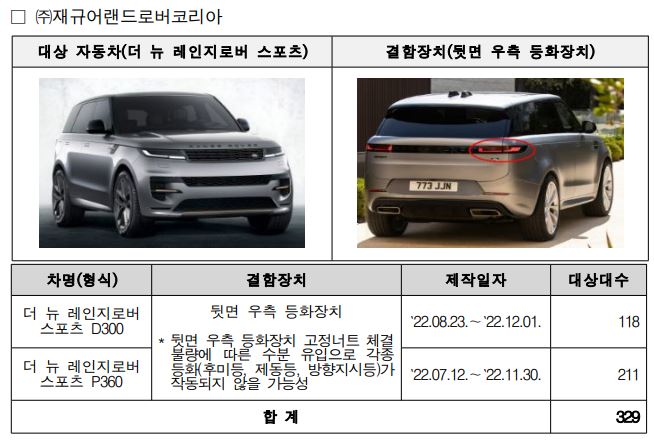 재규어랜드로버: 더 뉴 레인지로버 스포츠 P360 등 2개 차종 329대